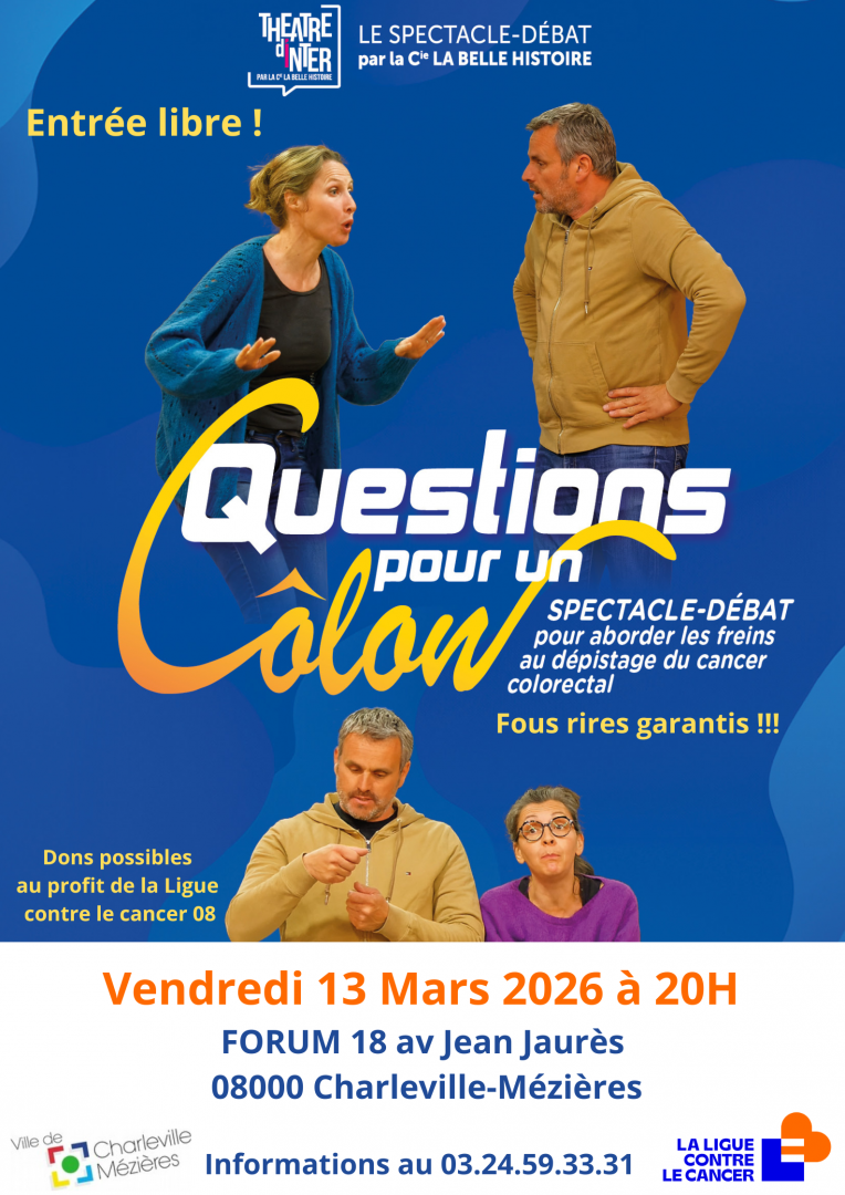 Un spectacle drôle, intelligent et sans tabou pour parler autrement du dépistage du cancer colorectal. Humour, échanges, rires et réflexion garantis ! Dons possibles au profit de la Ligue contre le cancer 08 ! Venez rire, apprendre et échanger autour d'un sujet essentiel… sans prise de tête !